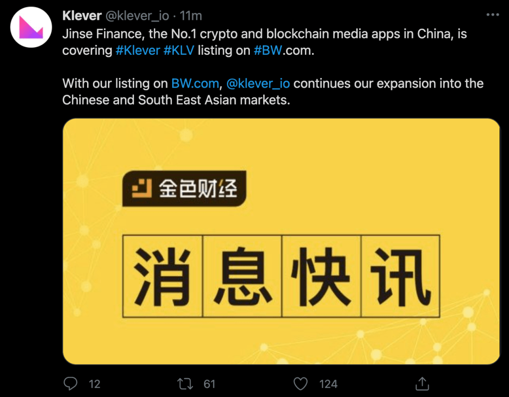 And then, before the fire emojis had even been given a chance to fully burn, Klever also announced Thursday morning that the KLV token will be available in the “Chinese and South East Asian markets” through BW.com beginning on March 22 – the same date as the beginning of the three-day KFI mining event.